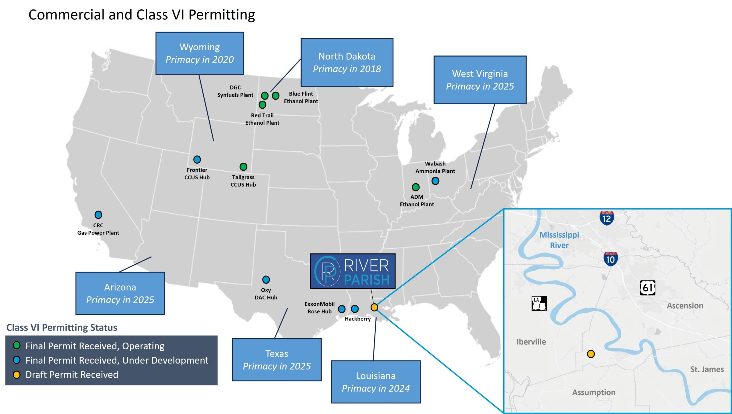 In December 2025, the Louisiana Department of Conservation and Energy (C&E) issued RPS a draft Class VI permit for its first injection well, which will be used to serve its initial customer. RPS is the second project in Louisiana and the first in the Mississippi River corridor to receive a draft Class VI permit and expects to be the first project in Louisiana to geologically sequester CO2 starting in 2027.